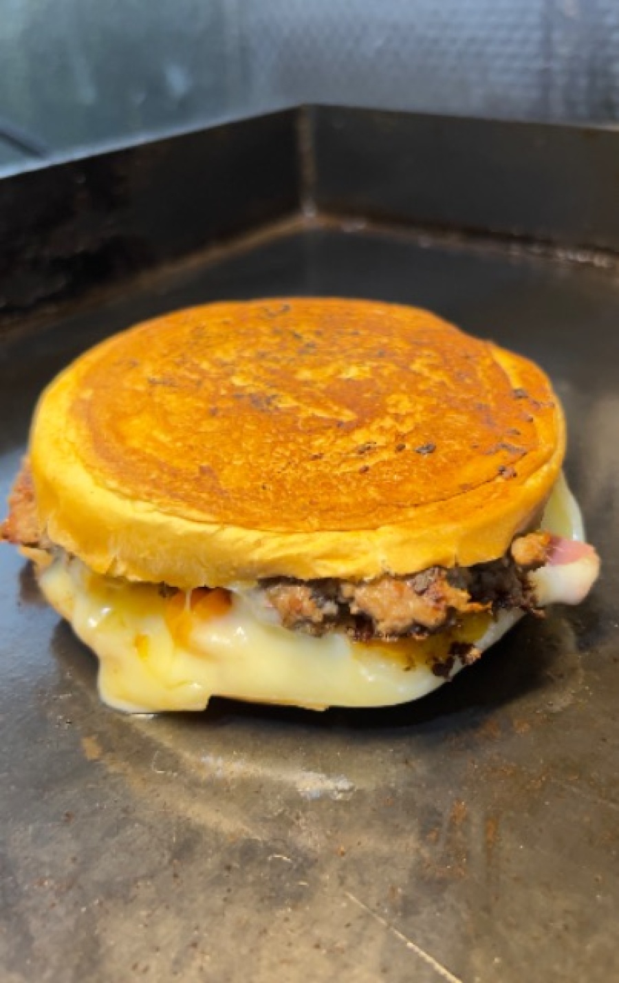 PÃO BRIOCHE, BLEND 100g, QUEIJO CHEDDAR, BACON, CEBOLA CARAMELIZADA(contém pimenta), BARBECUE NO PÃO.