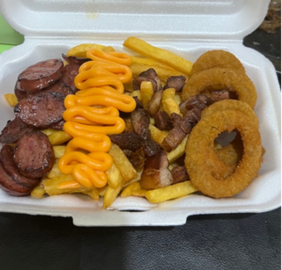 400g DE BATATA, CALABRESA, BACON, ANEIS DE CEBOLA E CHEDDAR.