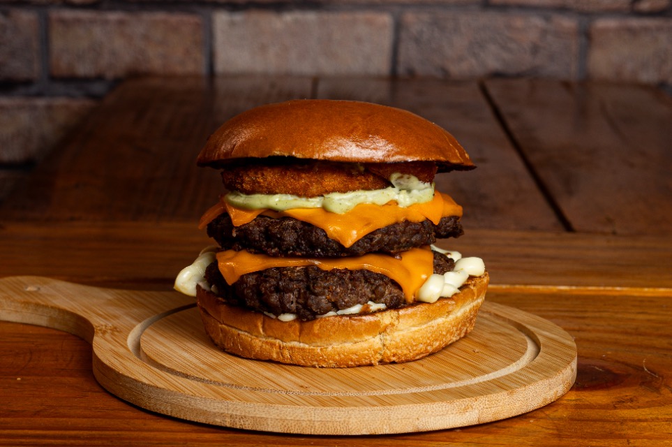 PÃO BRIOCHE, 2 BLEND 100g, QUEIJO CHEDDAR, BACON, ANEIS CEBOLA, MAIONESE TEMPERADA NO PÃO, CATUPIRY ORIGINAL .