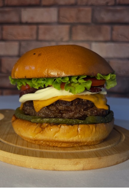 PÃO BRIOCHE, 2 BLEND DE 100g, SALADA, QUEIJO CHEDDAR, PICLES, BACON, CREME CHEESE.