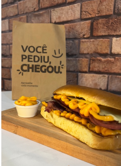 BAGUETE FRANCESA, BLEND DE 100g, BACON, CALABRESA , MOLHO CHEDDAR, MUSSARELA MAÇARICADA, TOMATE E CEBOLA REFOGADA.