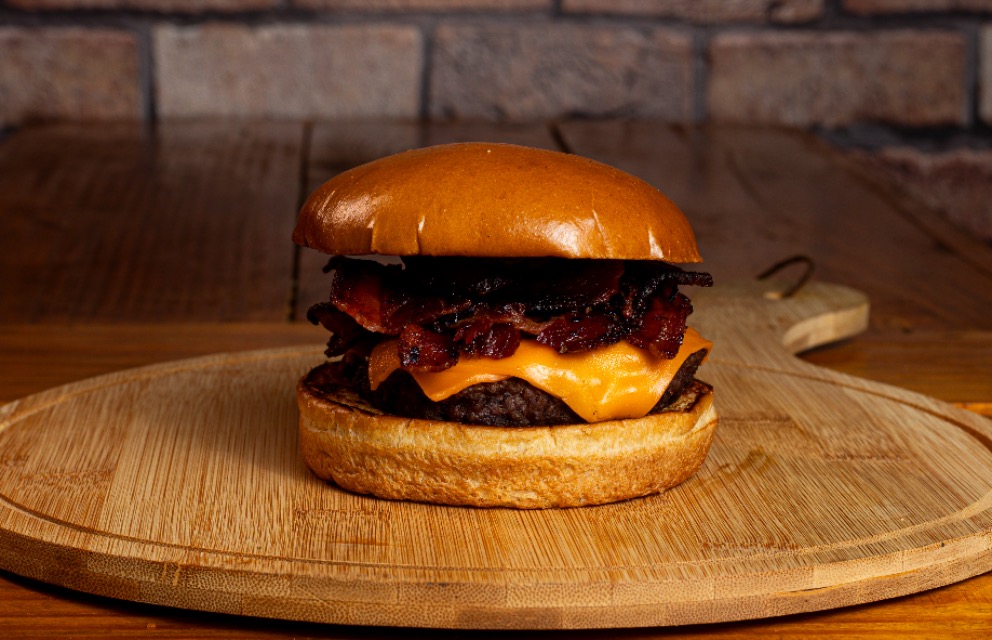 PÃO BRIOCHE , 2 BLEND DE 100g, BACON EM DOBRO, QUEIJO CHEDDAR.